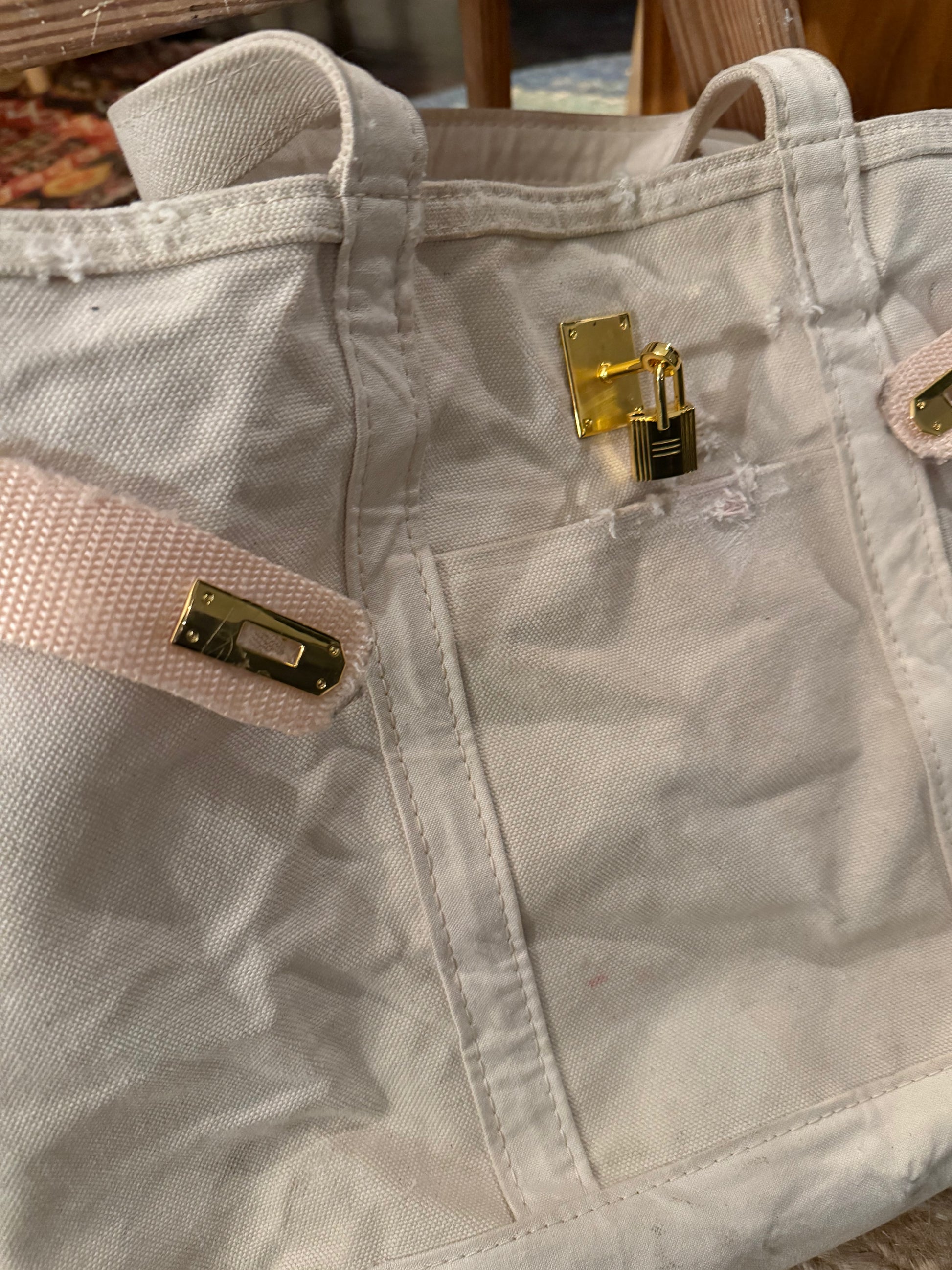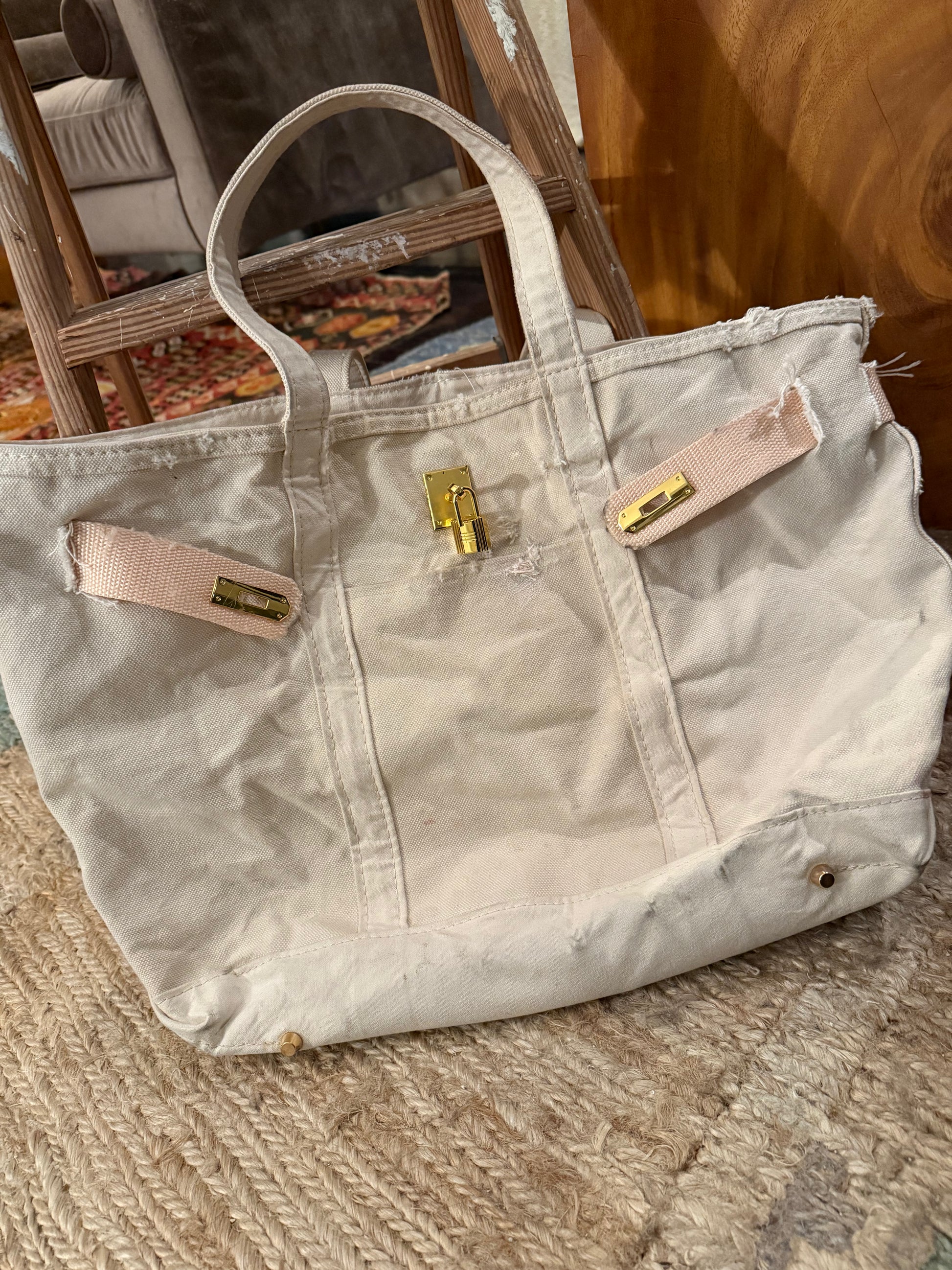 This worn in, distressed tote has been customized with birkin style gold hardware, a cargo strap that runs thru raw edge cuts
